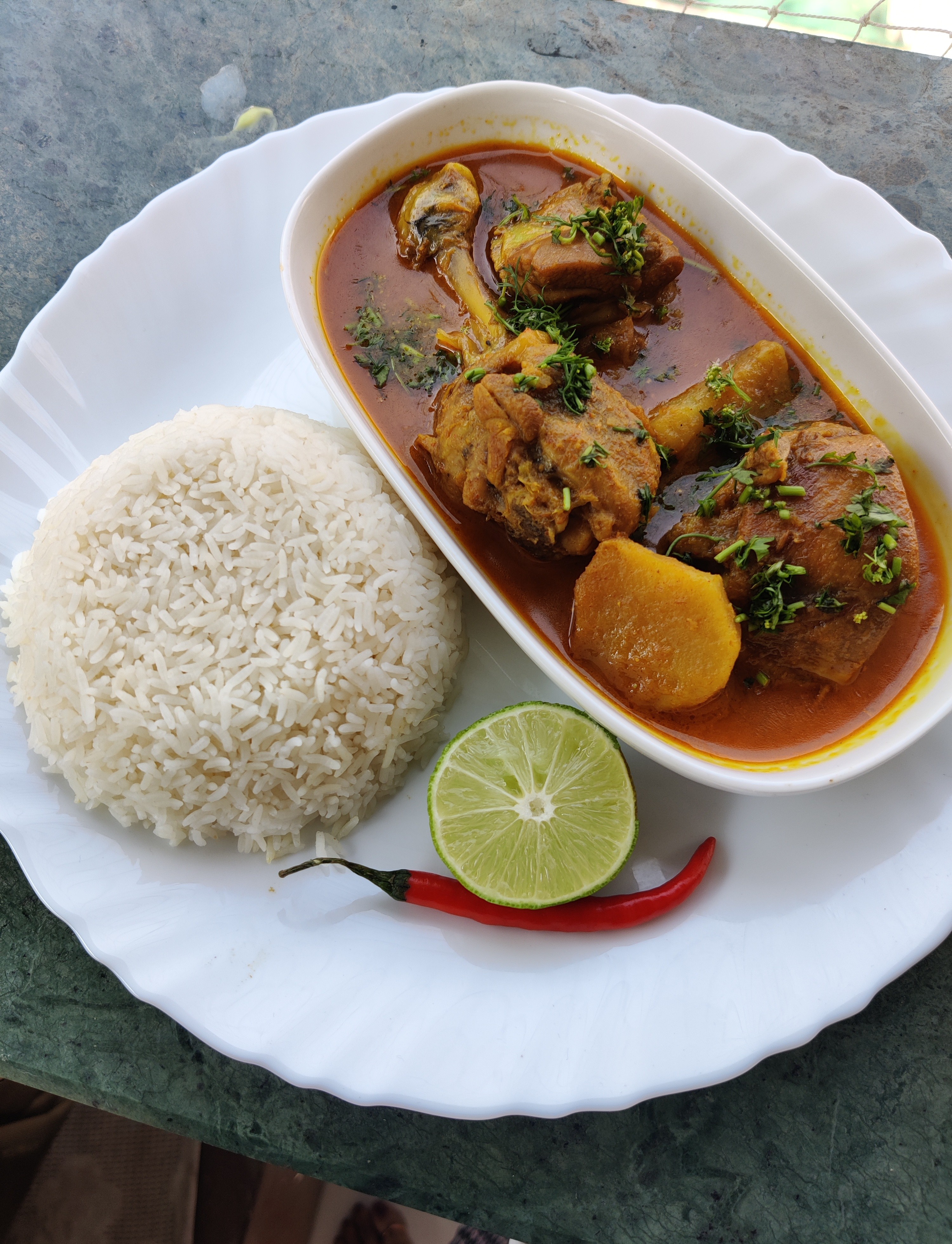 Delicious and aromatic Chicken Curry cooked with potatoes and freshly grounded spices with Rice.