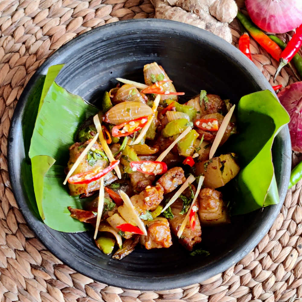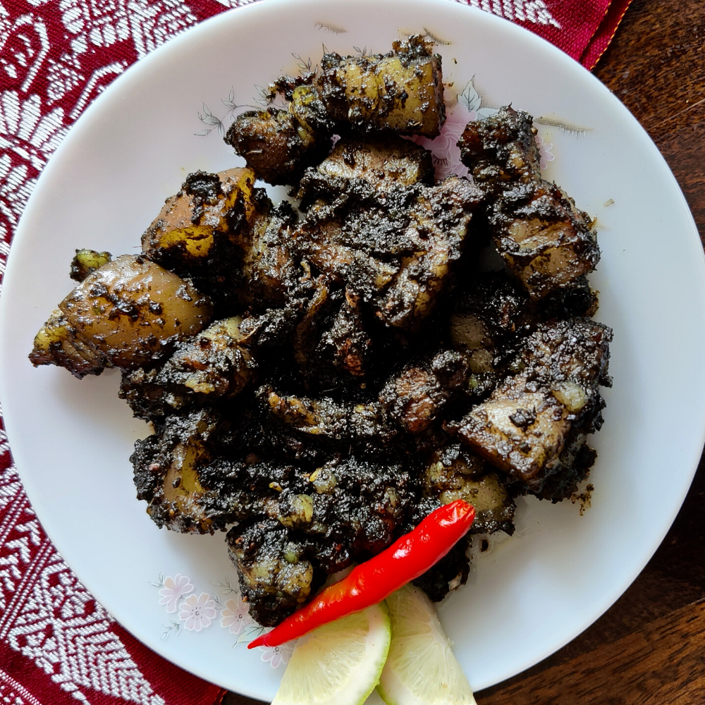 Pork cooked with black sesame seeds giving it a wonderful nutty flavour.