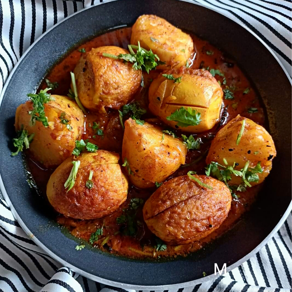 Delicious Egg Curry cooked with potatoes and freshly grounded spices.