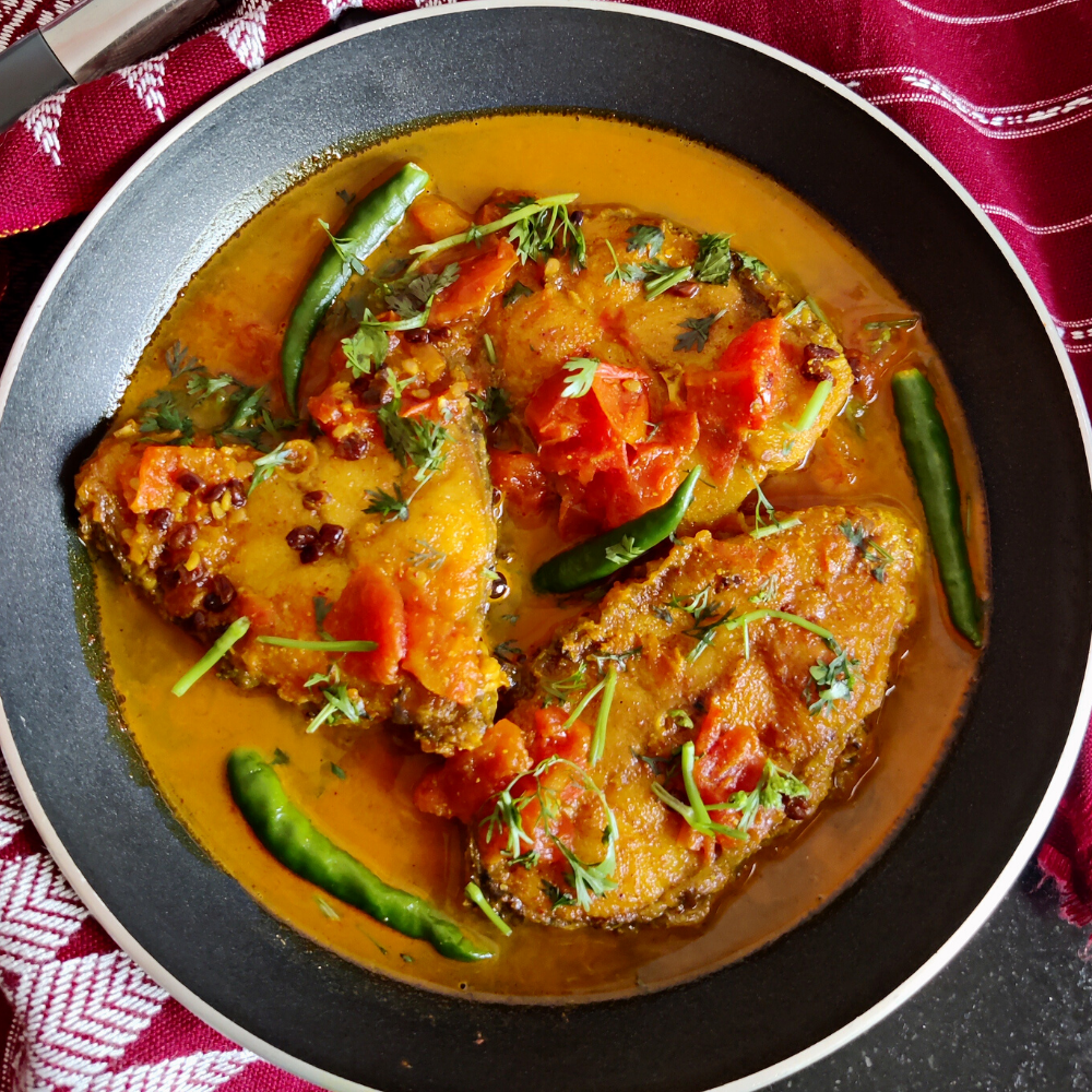 Tangy Fish Curry (2 Fish Pieces) cooked with tomatoes and freshly grounded spices. (Minimum 2 Portions to be ordered)