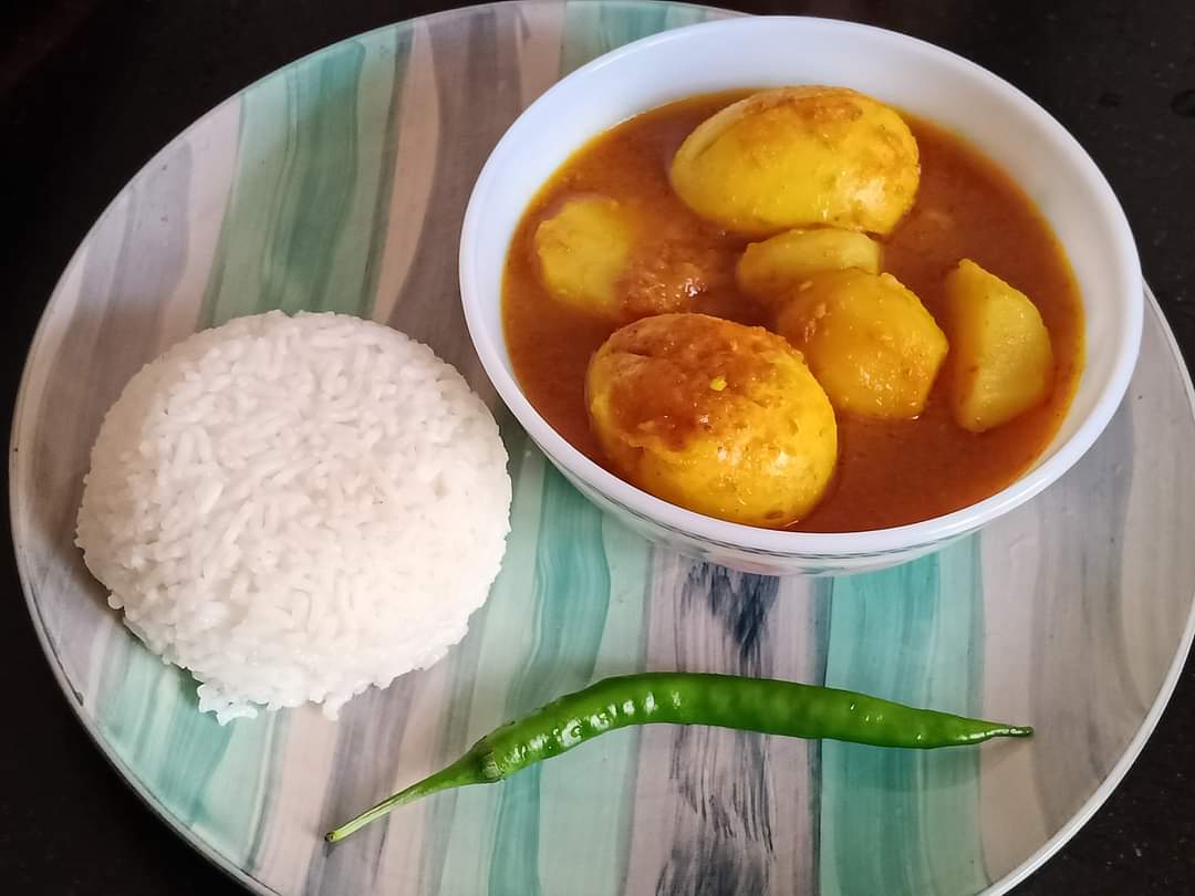 Delicious Egg Curry cooked with potatoes and freshly grounded spices served with Rice.