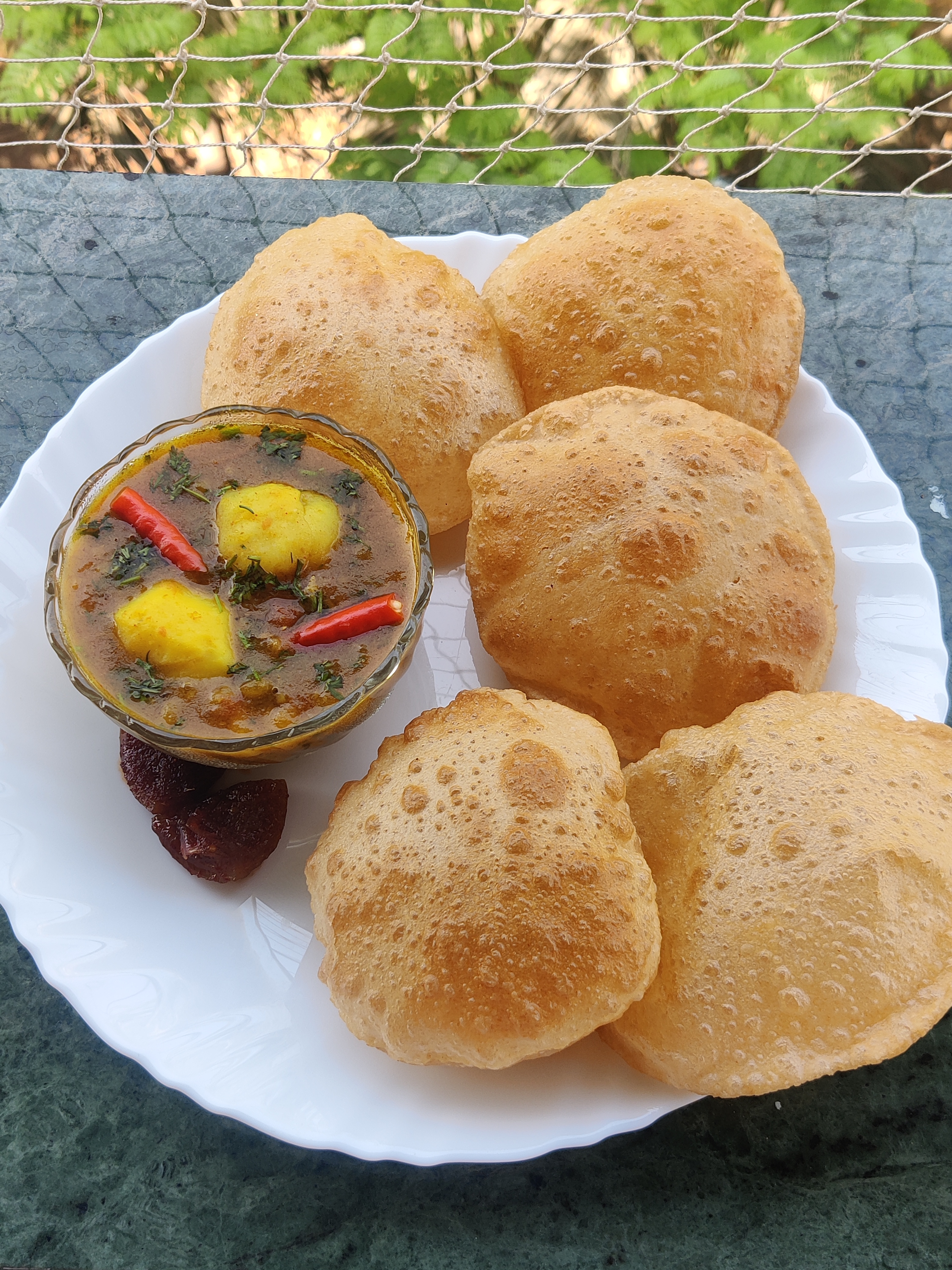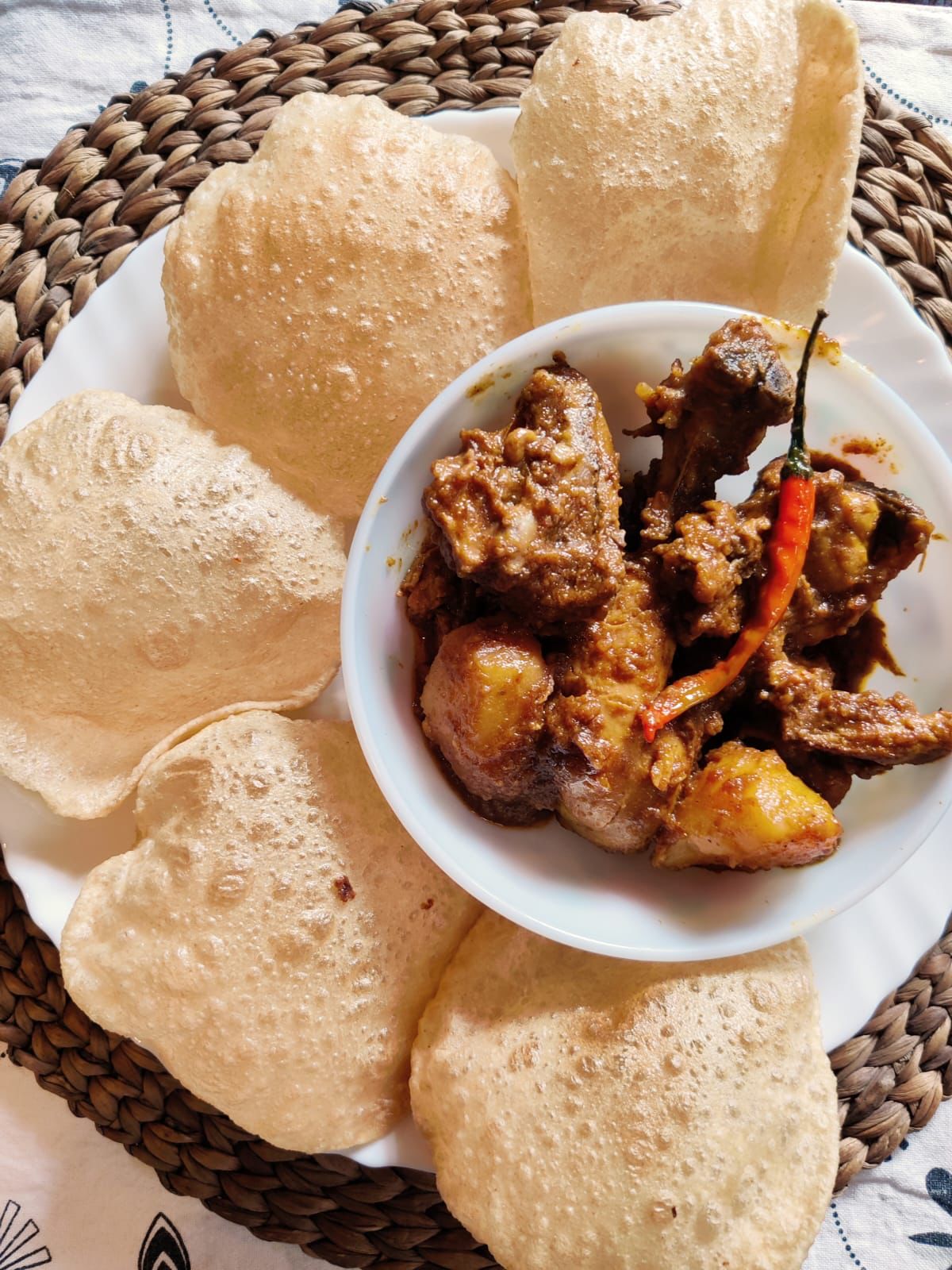 Chicken Kosha cooked with freshly ground spices and served with 5 wheat pooris.